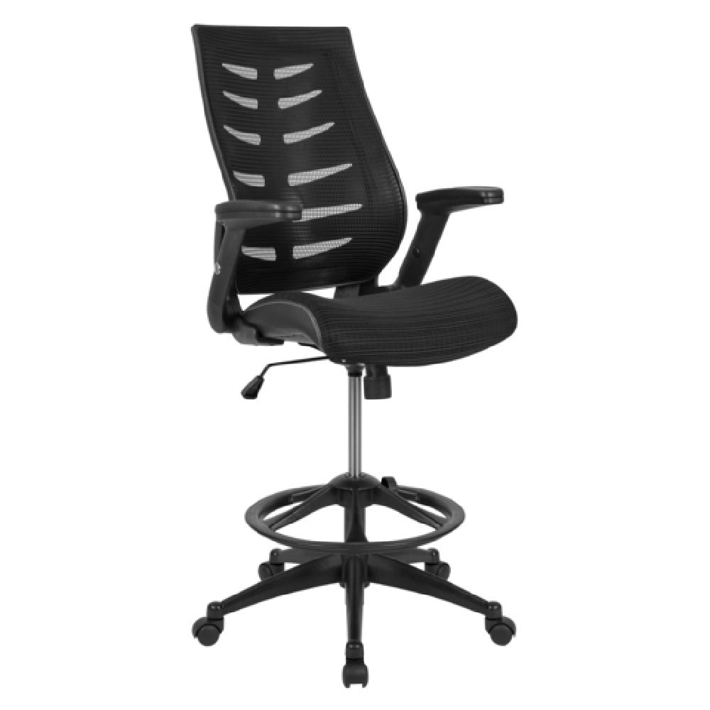 This executive swivel chair integrates a tilt lock mechanism and tilt tension adjustment knob for precise ergonomic positioning. Its high back spine and mesh construction promote breathability and lumbar support, reducing fatigue during extended use. The padded mesh upholstered waterfall seat enhances comfort, while height-adjustable flip-up arms facilitate ergonomic versatility. The chair’s durable black nylon base and dual wheel casters ensure stability and ease of movement in high-traffic office areas. The adjustable foot ring and CA117 fire-retardant foam further increase safety and functionality, making it a dependable choice for professional environments requiring customized ergonomics and durable performance.