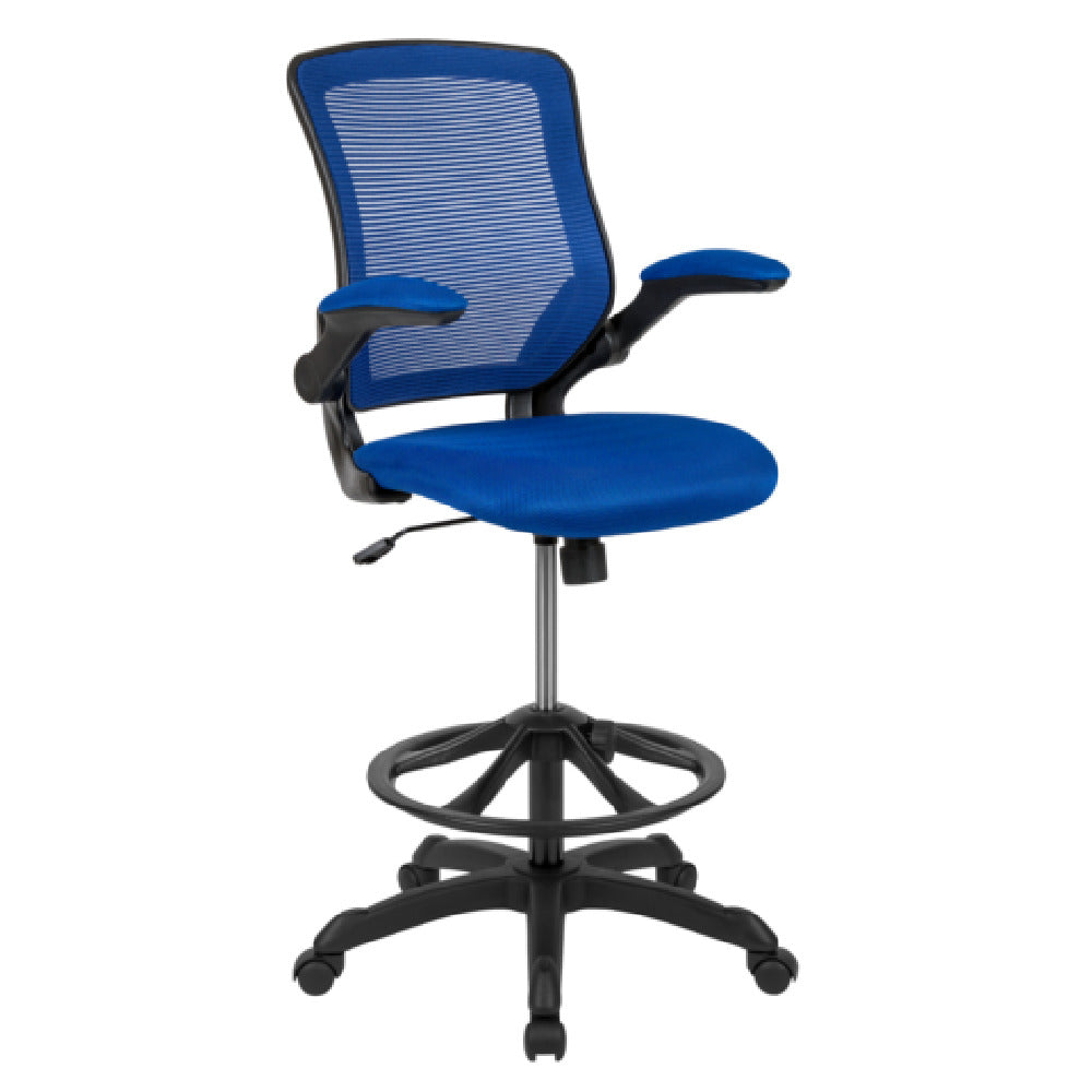 The Flash Furniture BL-ZP-8805D-BLUE-GG Kale Drafting Chair is a professional-grade seating solution designed for versatile use in commercial workspaces requiring adjustable, ergonomic drafting chairs. Featuring a height range from 42" to 49-1/2", this chair provides precise height customization to accommodate various drafting, design, or technical tasks. Constructed with a breathable mesh back for enhanced airflow and a padded mesh upholstered waterfall seat for user comfort, it supports up to 250 pounds. The mid-back design integrates built-in lumbar support, facilitating proper ergonomics for prolonged use. Equipped with a tilt lock mechanism, tilt tension adjustment, padded flip-up arms, and a height-adjustable nylon foot ring, this chair offers optimized comfort and operational efficiency in technical, drafting, and architectural environments. Its nylon base with dual wheel casters enhances stability and mobility, making it suitable for demanding professional settings.