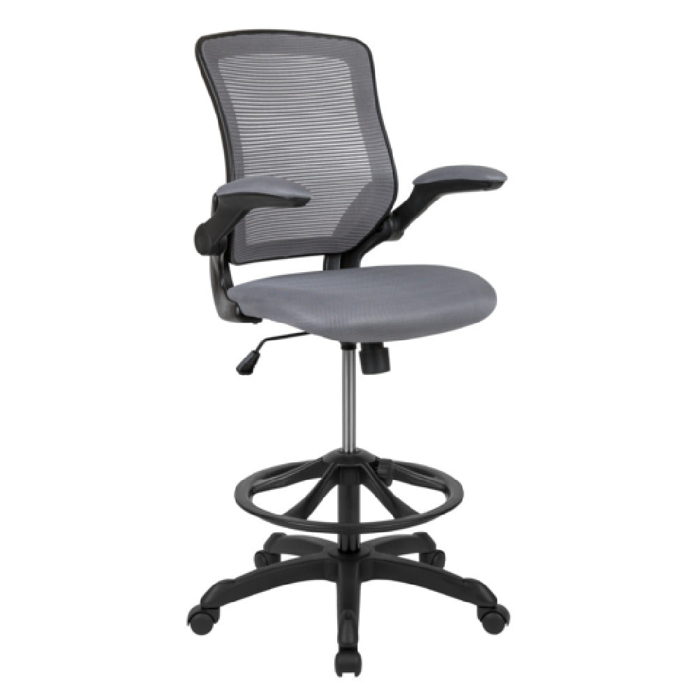 Compared to similar drafting chairs, the Flash Furniture BL-ZP-8805D-DKGY-GG distinguishes itself through its lightweight yet sturdy nylon base, easy height adjustment, and breathable mesh support, all tailored for professional environments. Its durability and ergonomic features support sustained productivity, reducing fatigue during long work sessions and enhancing workflow efficiency. The inclusion of padded flip-up arms and a fire-retardant seat foam underscores its safety and comfort features, setting a high standard among commercial draft seating options.