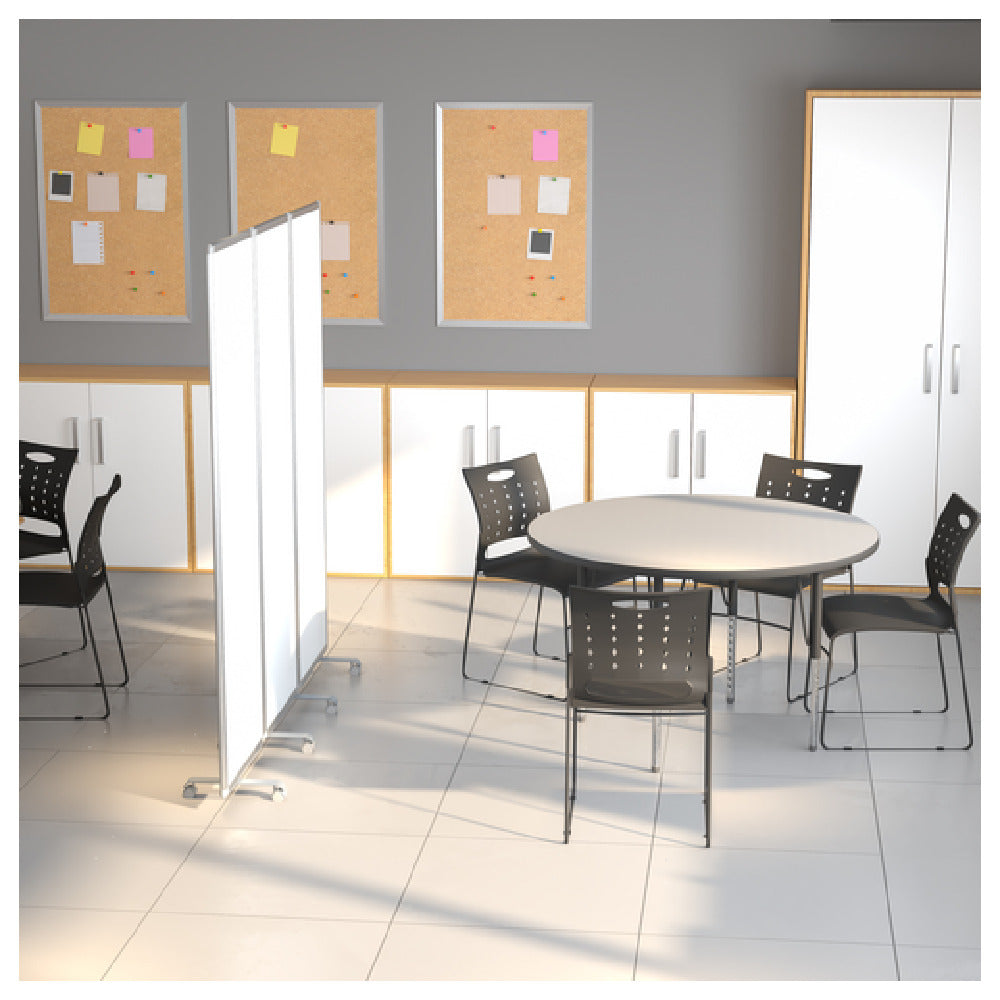 A commercial room divider screen partition is a structural component designed to segment or define spaces within professional environments such as offices, classrooms, or conference centers. It typically features a sturdy frame with a visual surface, like a magnetic whiteboard, that supports writing, display, or interactive presentations. Installed in various configurations, the Flash Furniture BR-PTT001-3-M-60183-GG Whiteboard Partition provides flexible spatial management and collaborative functionality, making it suitable for educational facilities, training rooms, and corporate settings that demand adaptable partitions to enhance workflow and communication.
