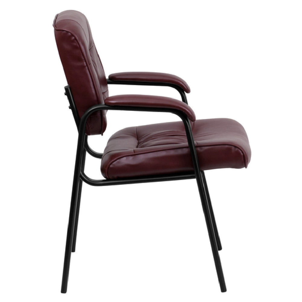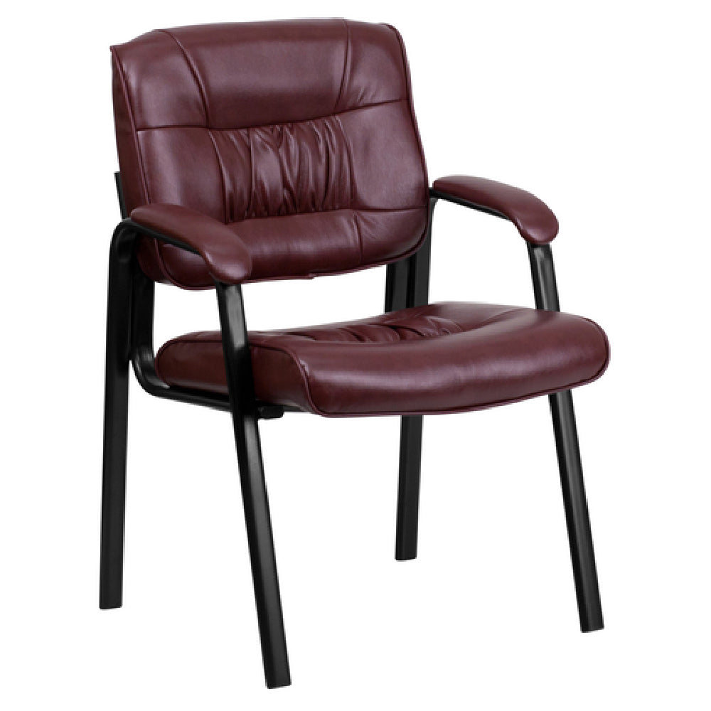 The Flash Furniture BT-1404-BURG-GG Executive Side Reception Chair is a commercial-grade indoor seating solution designed for professional environments such as lobbies, waiting areas, and reception spaces. This chair features a durable black metal frame with floor glides, supporting up to 250 pounds. Its upholstered seating, made from LeatherSoft, includes a tufted back and waterfall seat with contoured cushions and padded arms to provide ergonomic comfort. Ideal for high-traffic commercial settings, it combines aesthetic appeal with functional resilience, offering a statement piece that meets the demands of modern office reception zones and waiting areas.