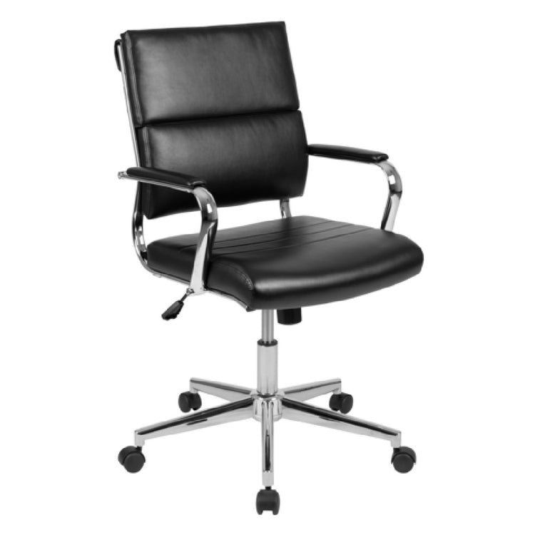 Why choose the Flash Furniture BT-20595M-2-BK-GG Hansel Swivel Office Chair over similar models? Its combination of sturdy LeatherSoft upholstery, a reliable swivel mechanism, and contemporary design provides lasting durability and professional aesthetics. The chair’s ergonomic mid-back support enhances comfort during extended work periods, improving workflow efficiency without sacrificing style.