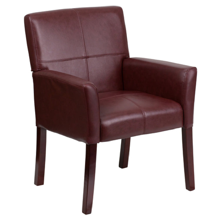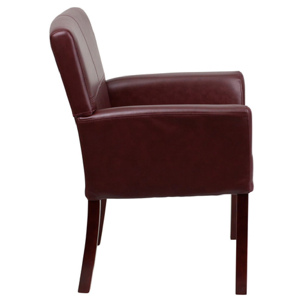The Flash Furniture BT-353-BURG-GG is engineered for dependable institutional seating, featuring an overall height of 35.25 inches with a width of 26.5 inches and a depth of 23 inches. Its construction includes bonded LeatherSoft upholstery supported by high-leg mahogany wood finished legs, providing stability with a total weight of approximately 32.9 lbs. The chair is designed for indoor use with dimensions that facilitate flexible placement within professional reception areas, lounges, or waiting zones. Its fire-retardant foam ensures safety compliance, while the straightforward assembly process requires no special tools beyond standard setup routines. Dimensions and materials support easy cleaning and maintenance compatible with typical commercial cleaning protocols. The chair's sturdy build ensures durability for moderate workloads, supporting continuous usage in busy environments.