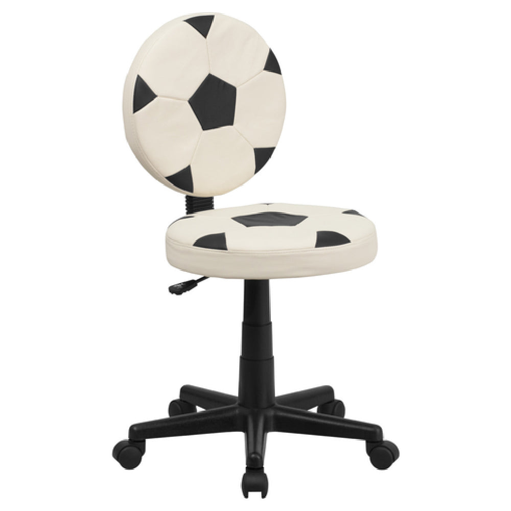 Flash Furniture, BT-6177-SOC-GG, Soccer Task Chair, 32-3/4" to 37-1/4" adjustable height, 150 lb. weight capacity, stitched black and white soccer ball pattern, round seat and back, vinyl upholstery, without arms, CA117 fire retardant foam, heavy duty black nylon base, dual wheel casters (assembly required) (in stock items usually ship within 24 hours)