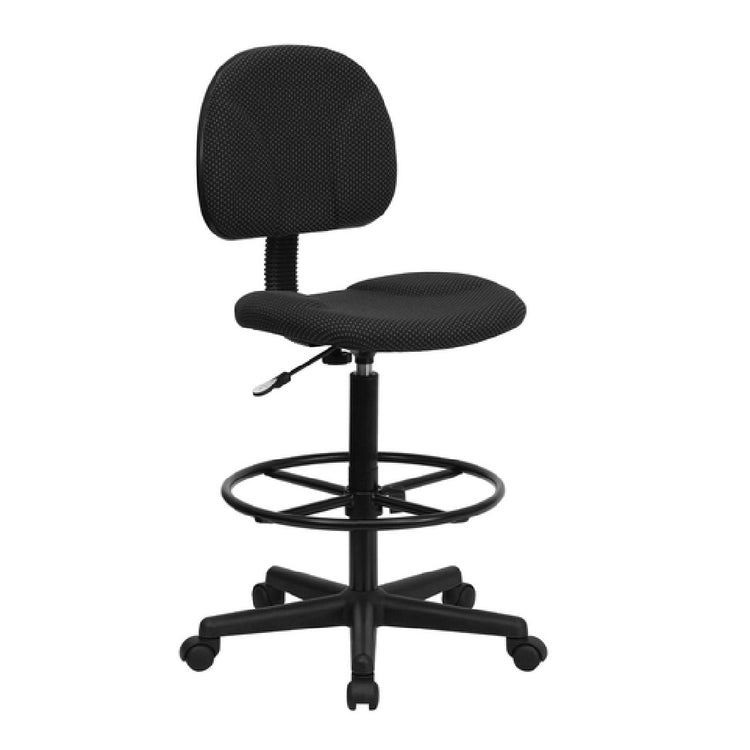 The Flash Furniture BT-659-BLK-GG Ergonomic Swivel Drafting Stool is a professional-grade office seating solution designed for demanding work environments requiring ergonomic support and adjustability. This work stool features a height range of 38-1/4" to 42-3/4", providing versatile positioning for varying tasks in architectural, design, or technical settings. Built with a durable pin dot patterned polyester upholstery and a heavy-duty black nylon base, it supports up to 250 pounds of weight, ensuring reliable performance during extended use. Its low back design and contoured seat promote proper posture, while the back depth adjustment knob allows for personalized comfort. The adjustable gas cylinder and height-enhanced black foot ring optimize ergonomics, making it suitable for high-precision applications in commercial studios or technical workspaces.