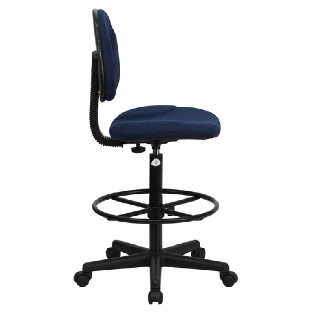The Flash Furniture BT-659-NVY-GG ergonomic drafting stool provides essential adjustability with a height range of 38-1/4" to 42-3/4”, supporting customization for different work surfaces. Its low back and contoured polyester upholstery enhance user comfort, while the back depth adjustment knob allows tailored lumbar support. The stool’s heavy-duty black nylon base with dual-wheel casters ensures stability and mobility on various flooring types. The inclusion of a height-adjustable black foot ring facilitates ergonomic foot positioning, and its air-cooled, fire-retardant foam seat enhances longevity. Designed for commercial drafting tasks and technical workstations, this stool ensures reliable performance under average workloads and easy maintenance, making it ideal for professional environments requiring frequent repositioning and adjustable ergonomics.
