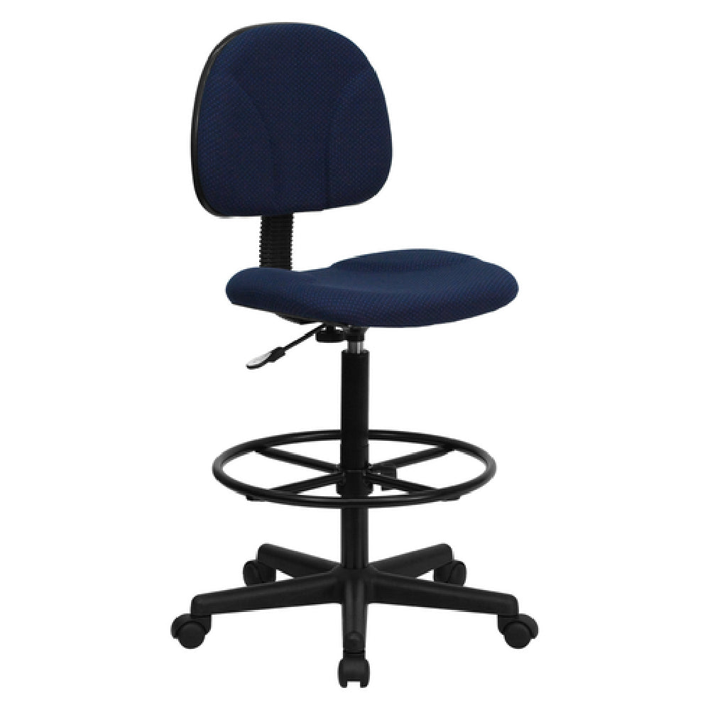 A commercial drafting stool is a height-adjustable ergonomic seating solution designed for technical and creative work environments, typically installed at drafting tables or elevated work surfaces. It features supportive contours, fire-retardant upholstery, and durable materials to withstand daily use in architectural, engineering, or design settings. The Flash Furniture BT-659-NVY-GG is fitted with a flexible height adjustment from 38-1/4" to 42-3/4", accommodating various work heights and ensuring ergonomic positioning for users engaged in detailed technical tasks or prolonged periods of seated work. Its fire-retardant foam, supportive back, and mobility features make it suitable for mid-volume professional applications requiring a reliable, adjustable work stool.