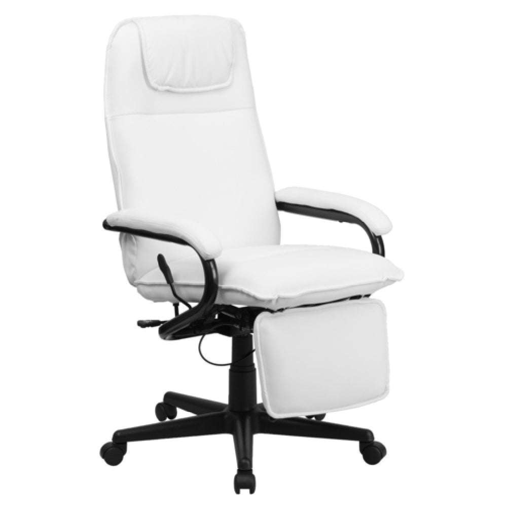 The Flash Furniture BT-70172-WH-GG Executive Reclining Swivel Office Chair is a professional-grade seating solution designed for executive office environments. It features a high-back design with optional headrest, upholstered in durable LeatherSoft material, providing ergonomic support for long periods of use. The chair adjusts from 42" to 45-3/4" in height and incorporates a reclining back paddle control for customizable comfort. Its 250 lb. weight capacity and padded arms ensure stability and user convenience. Equipped with a heavy-duty black nylon base and dual wheel casters, it facilitates smooth mobility across office surfaces. The chair includes a user-friendly touch height adjuster and a built-in footrest, offering versatile seating for executives or administrative professionals. Its fire-retardant CA117 foam enhances safety standards within demanding office settings.