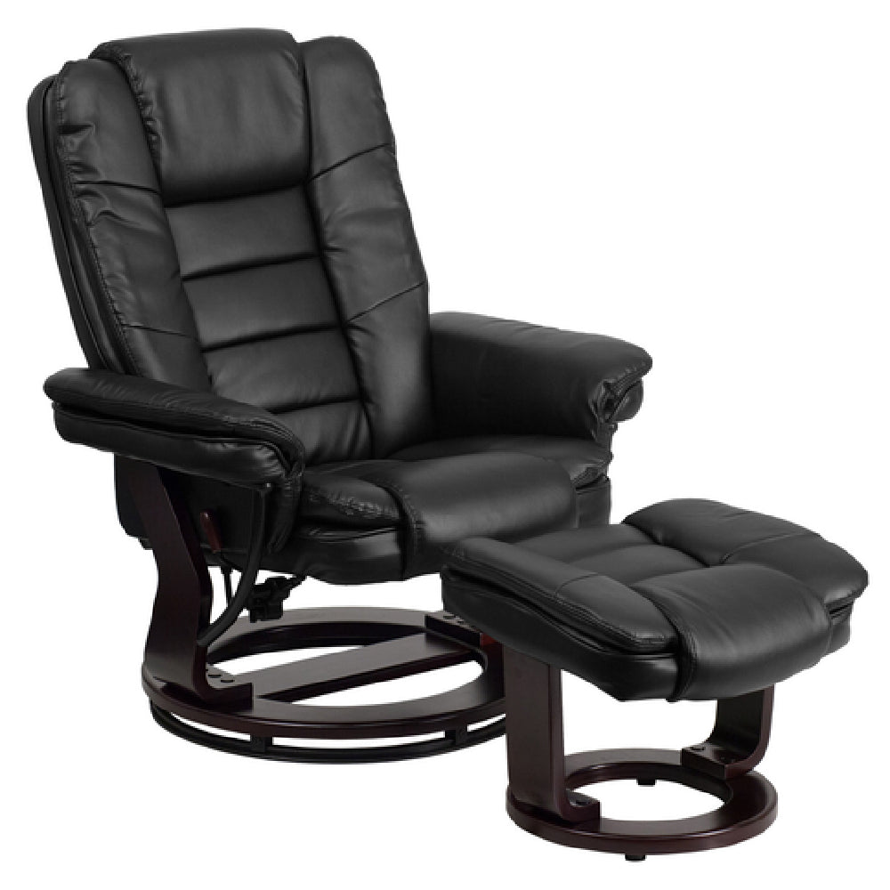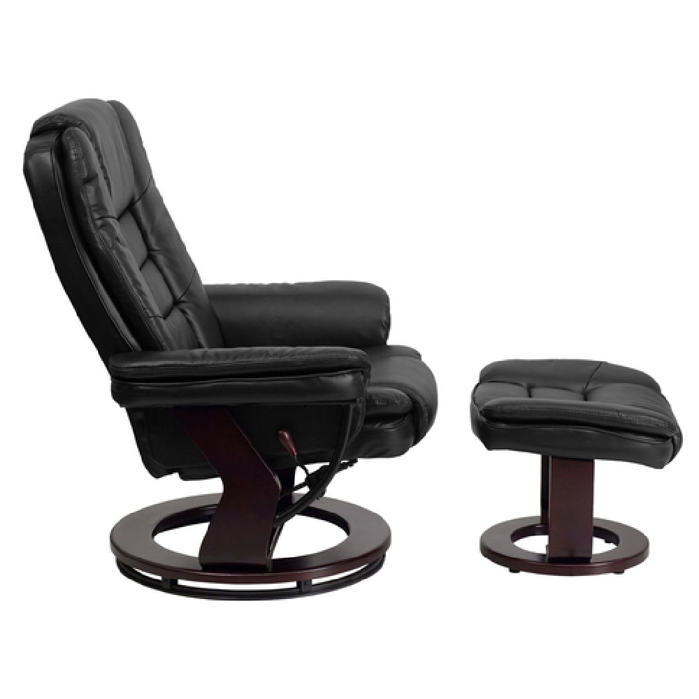 Flash Furniture, BT-7818-BK-GG, Swivel Recliner, 32-3/4"W x 32" - 40"D x 41"H, contemporary style, upholstered back and seat, integrated headrest, plush arms, wood base with mahogany finish, adjusting lever, ball-bearing swiveling base, includes 22"W x 18-1/2"D x 15"H ottoman, floor glides, CA117 fire retardant foam, LeatherSoft, black (assembly required) (in stock items usually ship within 24 hours)