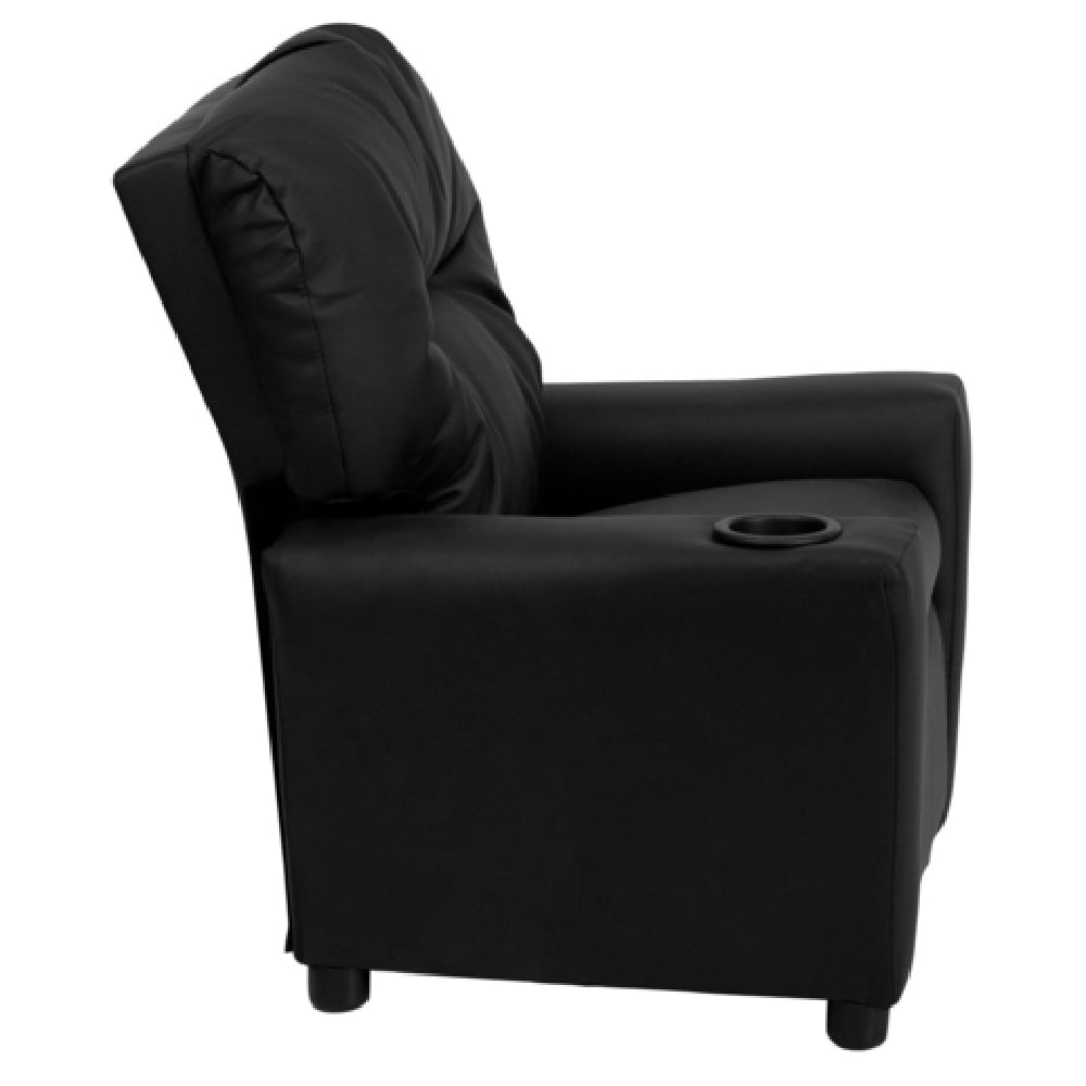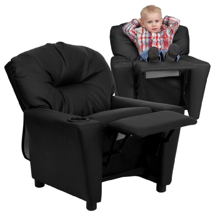 Flash Furniture, BT-7950-KID-BK-LEA-GG, Kids Recliner, 24-1/2"W x 25" - 39"D x 28"H, contemporary style, upholstered back and seat, plush padding, arm rests, cup holder, solid hardwood frame, raised black plastic feet, 90 lb. weight limit, CA117 fire retardant foam, safety feature: will not recline unless child is in seated position and pulls ottoman 1" out, LeatherSoft, black (assembly required) (in stock items usually ship within 24 hours)