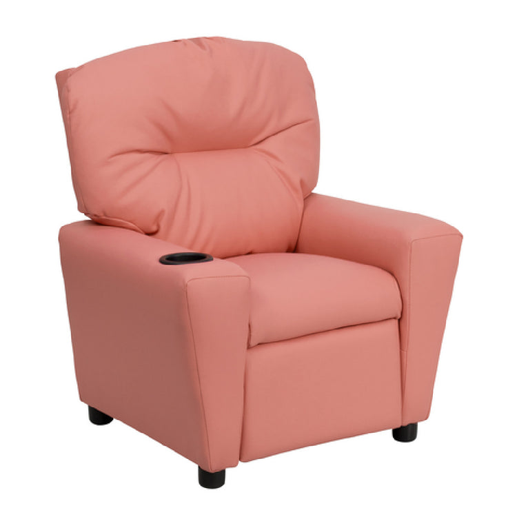 Flash Furniture, BT-7950-KID-PINK-GG, Kids Recliner, 24-1/2"W x 25" - 39"D x 28"H, contemporary style, upholstered back and seat, plush padding, arm rests, cup holder, solid hardwood frame, raised black plastic feet, 90 lb. weight limit, CA117 fire retardant foam, safety feature: will not recline unless child is in seated position and pulls ottoman 1" out, vinyl, pink (assembly required) (in stock items usually ship within 24 hours)