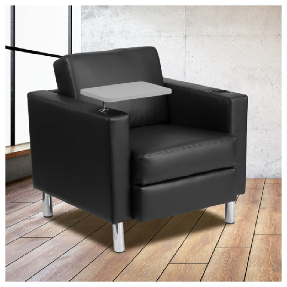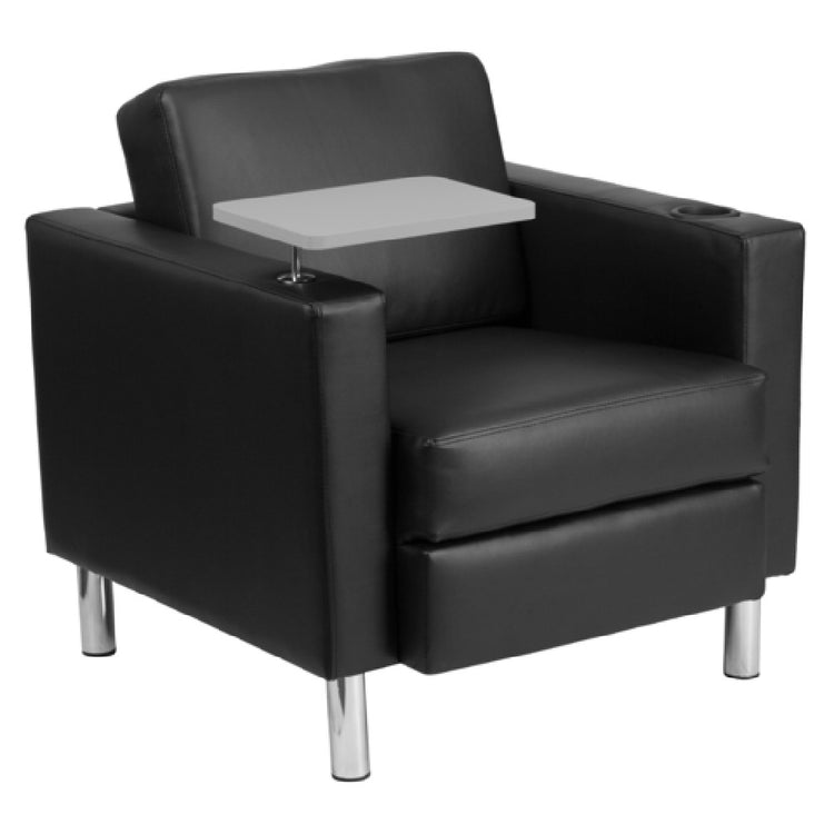 The Flash Furniture BT-8219-BK-GG George Guest Chair with Tablet Arm is a professional-grade indoor seating solution designed for hospitality, waiting areas, and professional office environments. This chair features LeatherSoft upholstery combined with plush foam seating for durability and comfort under moderate workloads. Its versatile tablet arm provides integrated functionality, measuring 13-3/4" wide by 10" deep, with a 360° swing capability facilitating use in conference rooms and reception areas. The model incorporates adjustable height capabilities through two metal rods and rests on chrome feet with plastic floor glides for stability and ease of maintenance. Its compact dimensions and ergonomic design support continuous user utilization, making it ideal for commercial lounge and guest seating applications.