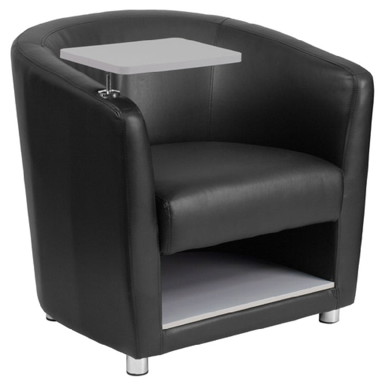 Flash Furniture, BT-8220-BK-GG, Guest Chair, barrel back, LeatherSoft upholstery, plush foam seat, fixed seat cushion, CA117 fire retardant foam, 13-3/4"W x 10"D light gray tablet arm (swings 360°), includes two metal rods for adjustable heights, 20-1/2"W x 20"D x 7"H open storage compartment under seat, chrome feet, plastic floor glides, black (assembly required) (in stock items usually ship within 24 hours)