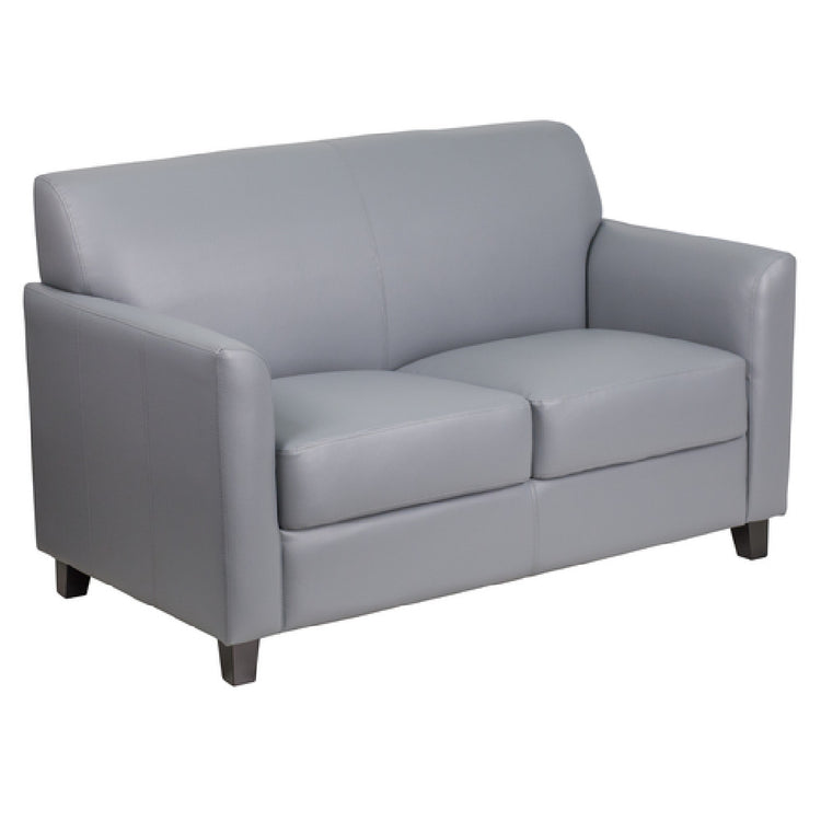 The Flash Furniture BT-827-2-GY-GG Hercules Diplomat Series Reception Loveseat is a commercial-grade indoor sofa designed for professional reception areas and lounge spaces. Featuring LeatherSoft upholstery with plush cushions, flared arms, and a sturdy hardwood construction, it integrates seamlessly into executive lobbies, waiting rooms, and hospitality environments. Its dimensions of 52 inches wide by 29 inches deep and height of 32-1/4 inches make it suitable for high-traffic public spaces requiring durable, comfortable seating. The fixed cushions and CA117 fire retardant foam ensure safety and longevity in busy commercial settings.