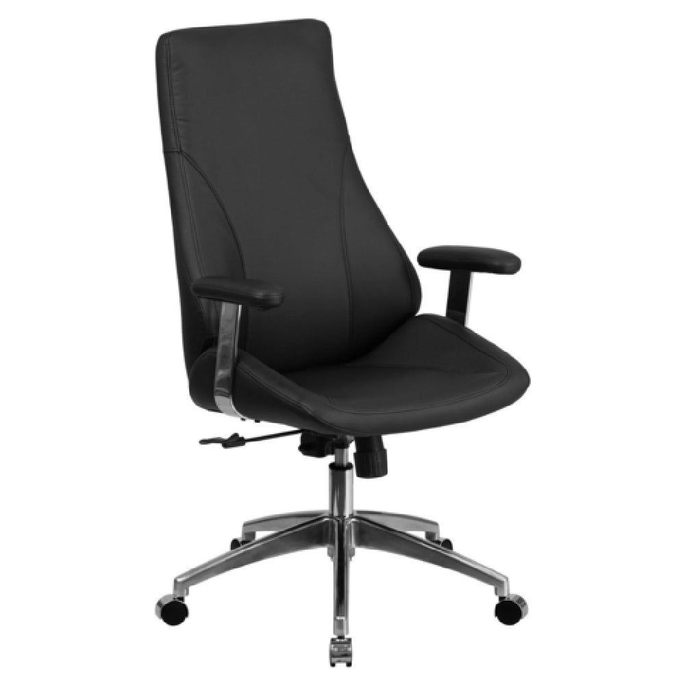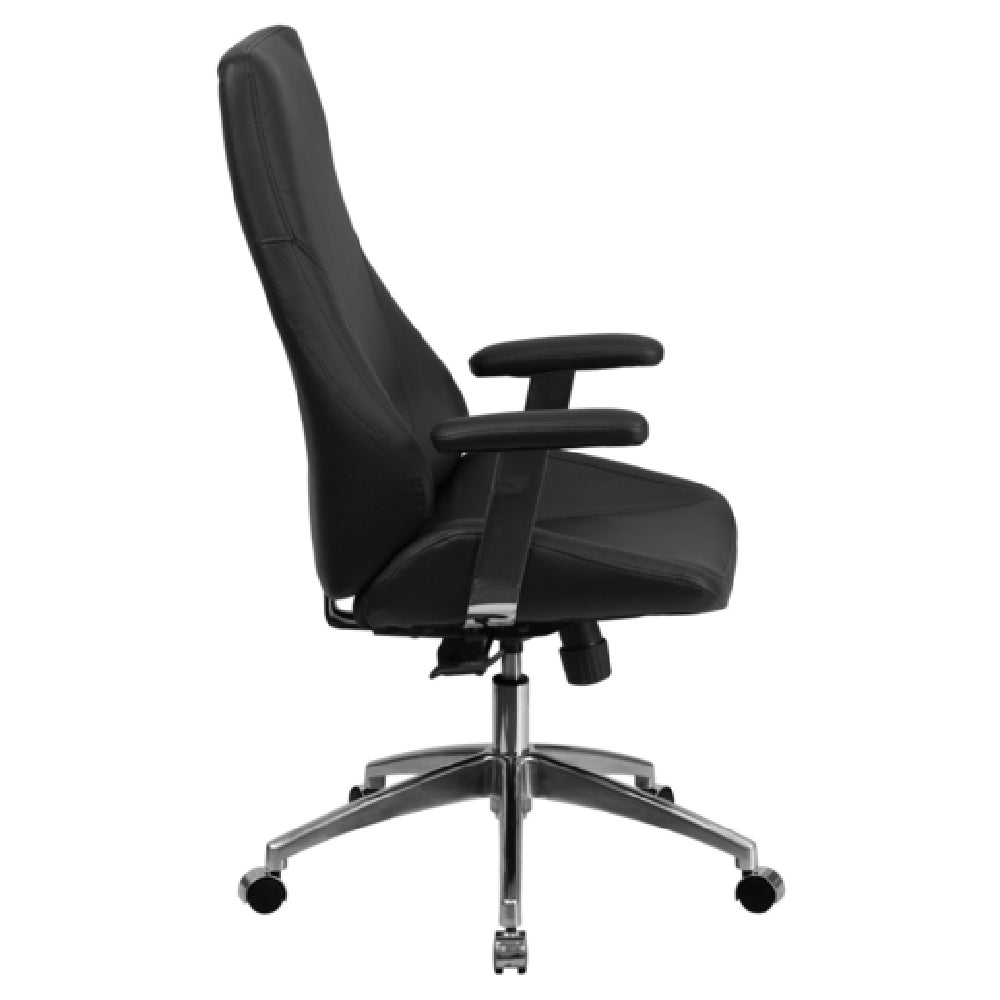 The Flash Furniture BT-90068H-GG executive swivel chair features a sleek, durable construction with a height adjustment range of 44-3/4" to 48-1/2" powered by a pneumatic lift mechanism. It includes a bonded leather upholstery surface, high back design, and padded chrome arms for ergonomic comfort. The base is made from heavy-duty aluminum with dual-wheel casters for mobility and stability on various floors. The chair supports up to 250 lb. and is designed to withstand prolonged daily use in busy office settings. It requires assembly, with all components optimized for easy maintenance. Operating in an indoor environment, it maintains thermal stability and resists common office wear, ensuring long service life.