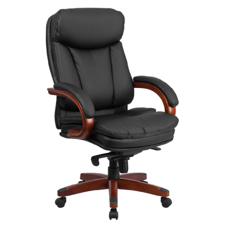 Flash Furniture, BT-90171H-S-GG, Executive Swivel Office Chair, 45-1/2" to 48" adjustable height, 250 lb. weight capacity, high back design, contoured seat and back, with pillow top headrest, LeatherSoft upholstery, built-in lumbar support, dual paddle control mechanism, 2-to-1 locking Synchro tilt adjustment, tilt tension adjustment knob, padded loop arms, CA117 fire retardant foam, mahogany wood capped metal base with black end caps, dual wheel casters, black (in stock items usually ship within 24 hours)