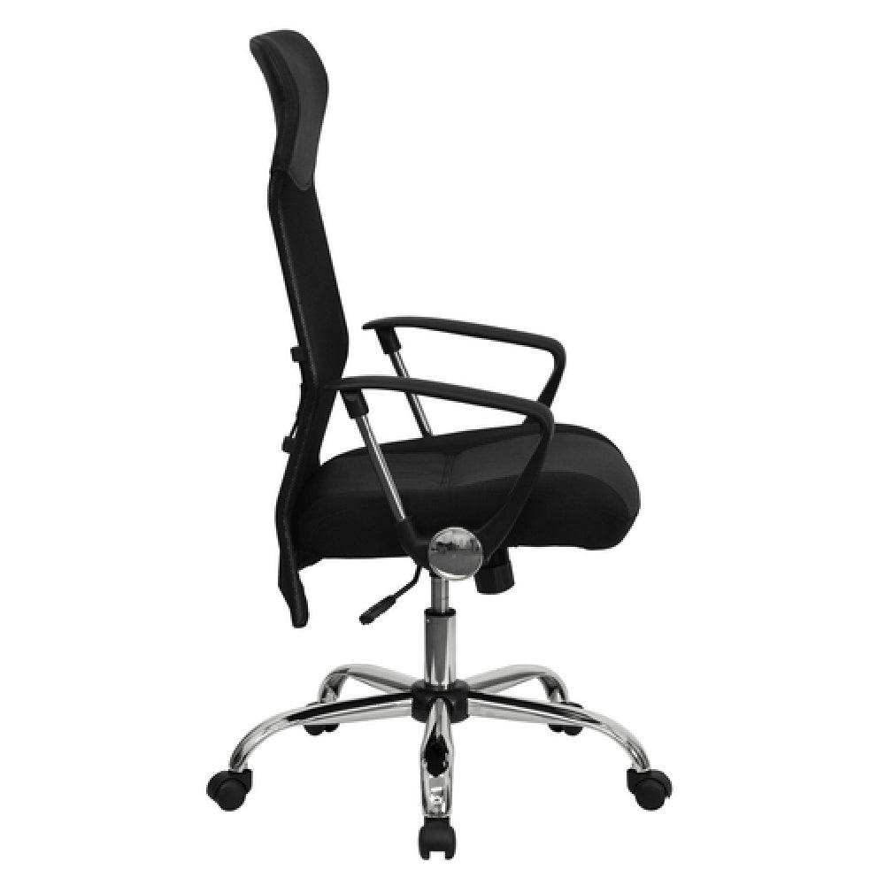 The Flash Furniture BT-905-GG Swivel Task Chair is a commercial-grade ergonomic seating solution designed for professional work environments. Featuring a high back and ventilated mesh backrest, this chair provides essential lumbar support and breathability. With an adjustable height range of 44" to 47" and a 250 lb. weight capacity, it caters to diverse user needs while ensuring durability and stability through a heavy-duty chrome base and dual-wheel casters. Its padded black leather and mesh upholstered waterfall seat, complemented by leather headrest, enhances comfort during extended periods of use, making it ideal for office applications, call centers, and workstation settings requiring reliable, adjustable seating with advanced ergonomic features. This model delivers precise height adjustment and tilt lock mechanisms for optimized posture support in demanding environments.