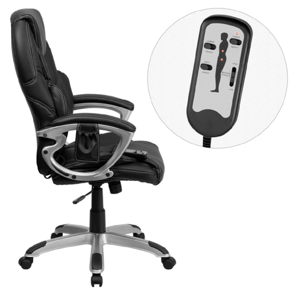 The Flash Furniture BT-9806HP-2-GG Massaging Executive Swivel Office Chair is a commercial-grade ergonomic seating solution designed for professional office environments requiring adjustable height and added comfort. Crafted with LeatherSoft upholstery and contrasting white stitching, this high-back chair features a contoured seat and lumbar support to enhance user posture during extended periods of use. Its remote-controlled massage functions, including power on/off, lumbar and thigh controls with variable intensity, address fatigue and promote circulation, making it suitable for executive offices and administrative spaces. The model supports up to 250 pounds and adjusts from 43" to 47" in height, ensuring customization for various workstation configurations. Its durable metal base with dual wheel casters facilitates mobility and stability, meeting the demands of demanding work settings with precision and reliability.
