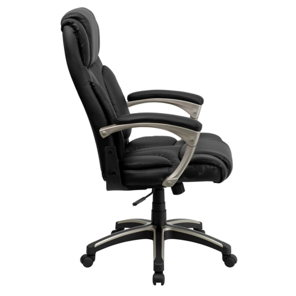 The Flash Furniture BT-9875H-GG Executive Swivel Office Chair is a professional-grade seating solution designed for executive workflows and high-demand office environments. Crafted with durable LeatherSoft upholstery and featuring a high back design, this chair provides added support for extended periods of use. Its height-adjustable range from 42-3/4" to 45-1/2" accommodates various ergonomic preferences, while a weight capacity of 250 lbs ensures reliable performance in demanding settings. The contoured back and waterfall seat improve comfort and promote proper posture, making it suitable for executive offices, conference rooms, and administrative workspaces requiring ergonomic seating with technical precision.