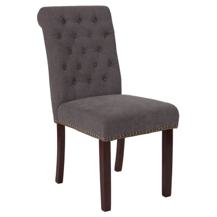 The Flash Furniture BT-P-DKGY-FAB-GG Hercules Series Parsons Side Chair exemplifies a modern indoor seating solution designed specifically for commercial environments. Crafted with a mid-century aesthetic, this chair features an upholstered button tufted rolled back and a cushioned seat, both padded with high-density fire-retardant foam compliant with CA117 standards. Its walnut-finished wood legs and brass nail head trim combine durability with refined style, making it suitable for hospitality and office settings seeking both form and function. With a height of 39.75 inches, width of 18.5 inches, and depth of 27.5 inches, this side chair provides a stable yet comfortable platform for extended use, coupling technical precision with design elegance.