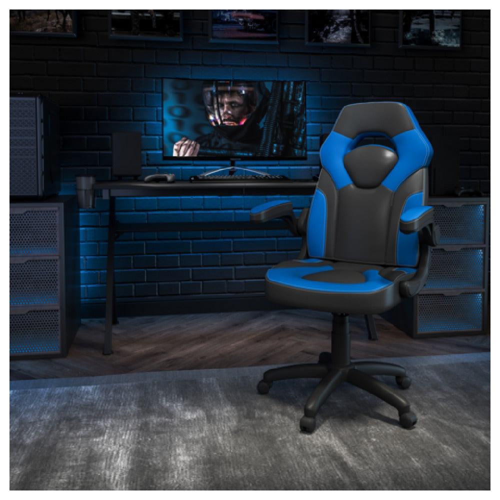 Flash Furniture, CH-00095-BL-GG, X10 Gaming Chair, 250 lb. weight capacity, LeatherSoft upholstery with mesh inserts, high-back design, lumbar support, tilt lock mechanism, tilt tension adjustment knob, padded flip-up arms, pneumatic seat height adjustment, nylon base, dual wheel casters, blue/black (assembly required)