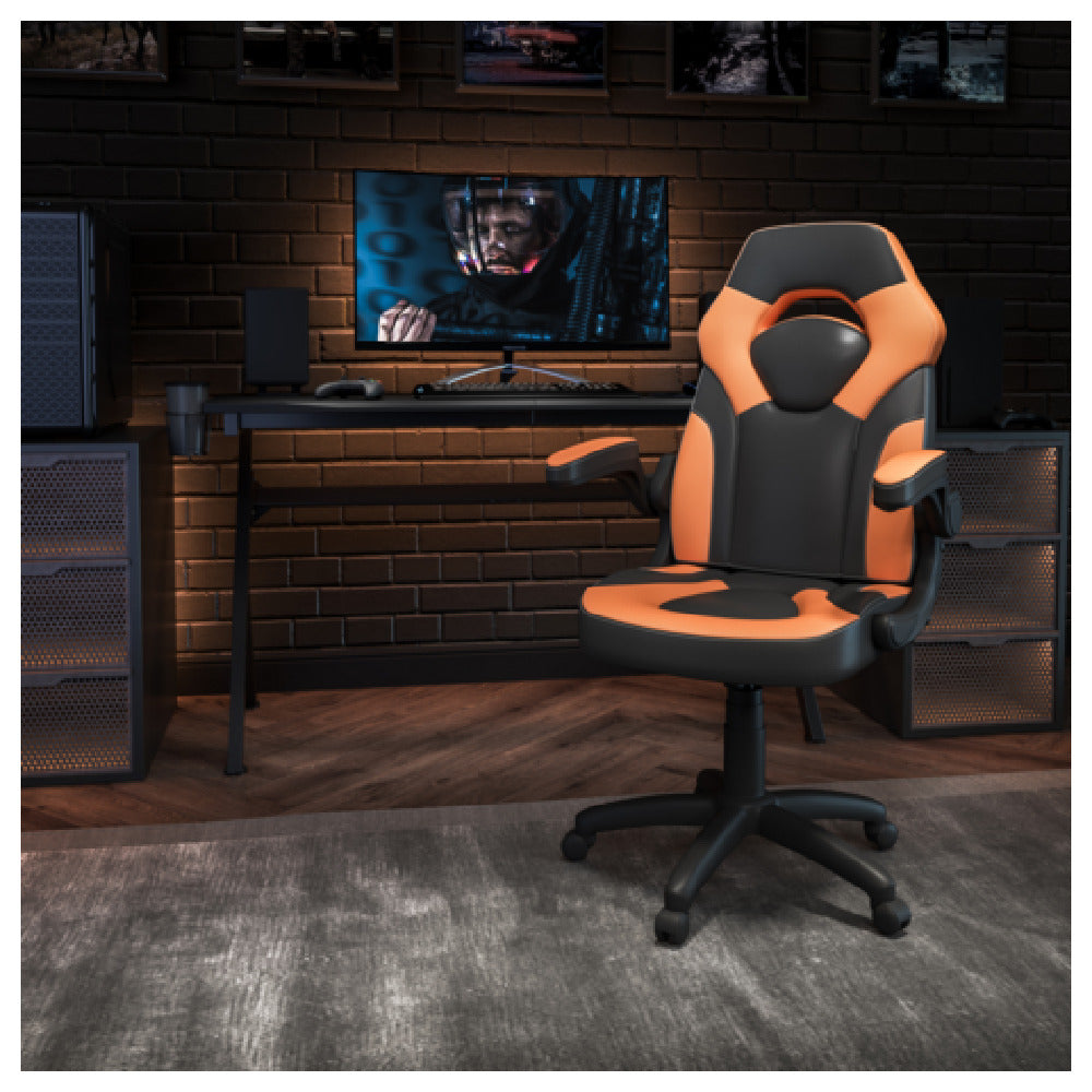 The Flash Furniture CH-00095-OR-GG X10 Gaming Chair is a premium swivel seating solution designed for high-performance ergonomic support in competitive gaming and professional work environments. Constructed with LeatherSoft upholstery and mesh inserts, this chair features a high-back design, lumbar support, and padded flip-up arms to enhance user comfort during extended periods of use. Capable of supporting up to 250 pounds, it includes a pneumatic seat height adjustment, tilt lock mechanism, and tilt tension adjustment knob, enabling customized positioning. The durable nylon base with dual wheel casters ensures smooth mobility and stability, making it suitable for eSports arenas, gaming lounges, and high-demand office settings. This model’s specifications highlight its suitability for rigorous daily use with precise ergonomic features and reliable construction.