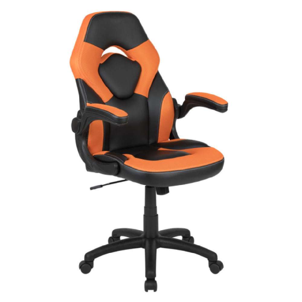 Flash Furniture, CH-00095-OR-GG, X10 Gaming Chair, 250 lb. weight capacity, LeatherSoft upholstery with mesh inserts, high-back design, lumbar support, tilt lock mechanism, tilt tension adjustment knob, padded flip-up arms, pneumatic seat height adjustment, nylon base, dual wheel casters, orange/black (assembly required)