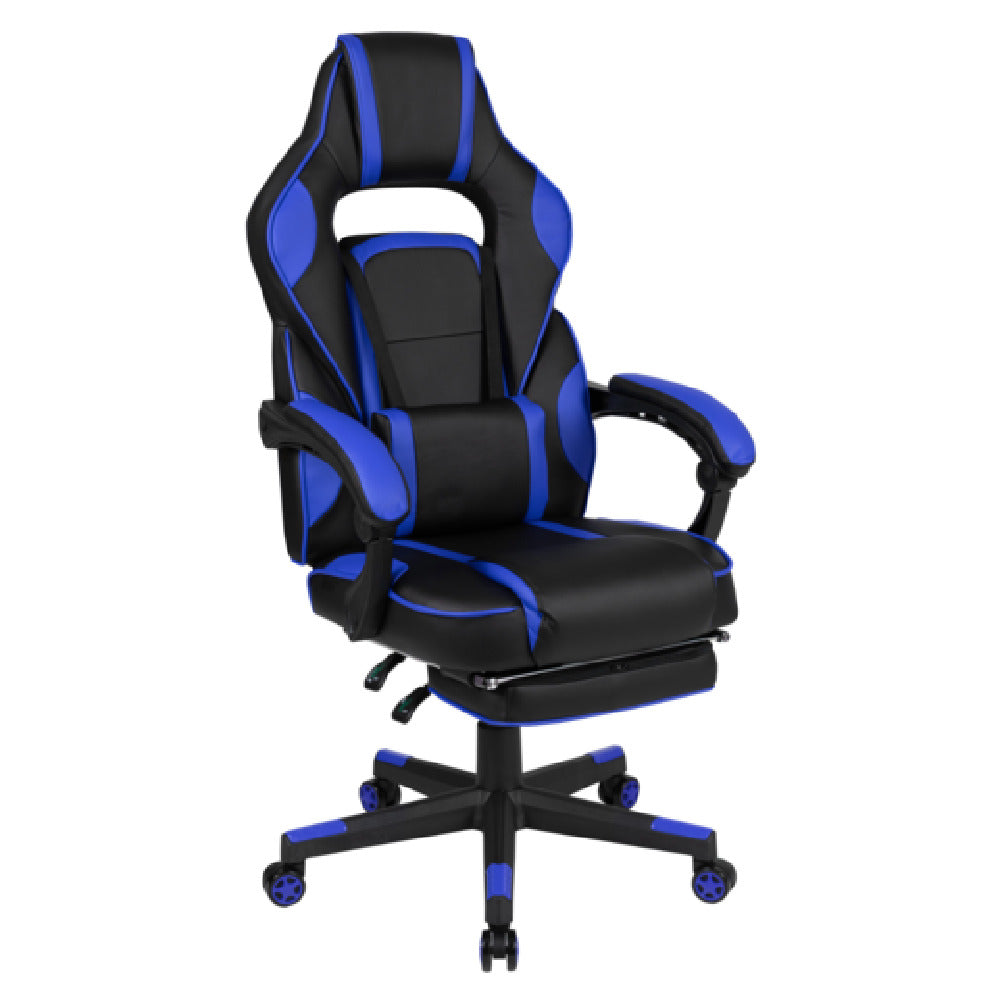 Why choose the Flash Furniture CH-00288-BL-GG X40 Gaming Chair over similar models? Its reinforced nylon base with end caps, combined with a 280 lb. capacity and LeatherSoft upholstery, ensures longevity and stability under demanding gaming conditions. The fully reclining back and removable massaging lumbar pillow provide ergonomic support tailored to intensive use. Its thoughtful design integrates seamlessly into professional gaming environments, offering highly adjustable features that enhance user performance and comfort, unlike standard gaming chairs with limited mobility or support options.