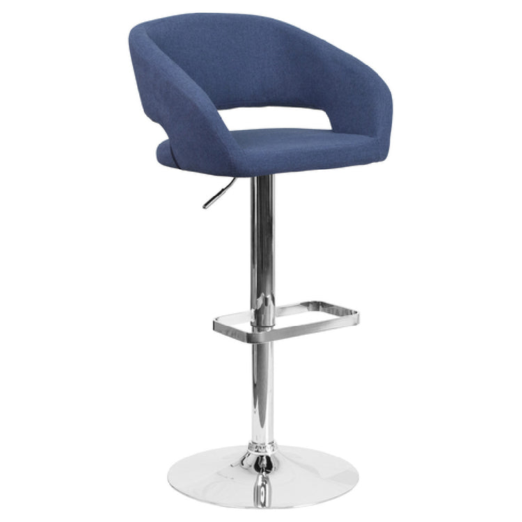 A commercial swivel bar stool is a durable seating solution designed for high-traffic hospitality environments. It features a rotating seat for guest comfort and efficient workflow. The Flash Furniture CH-122070-BLFAB-GG model, with its adjustable height, upholstered comfort, and sturdy chrome base, is ideal for busy restaurants, bars, or cafes requiring flexible seating at varying counter heights and frequent guest turnover. Its construction supports prolonged use in indoor foodservice settings, ensuring longevity and ease of maintenance for operators.