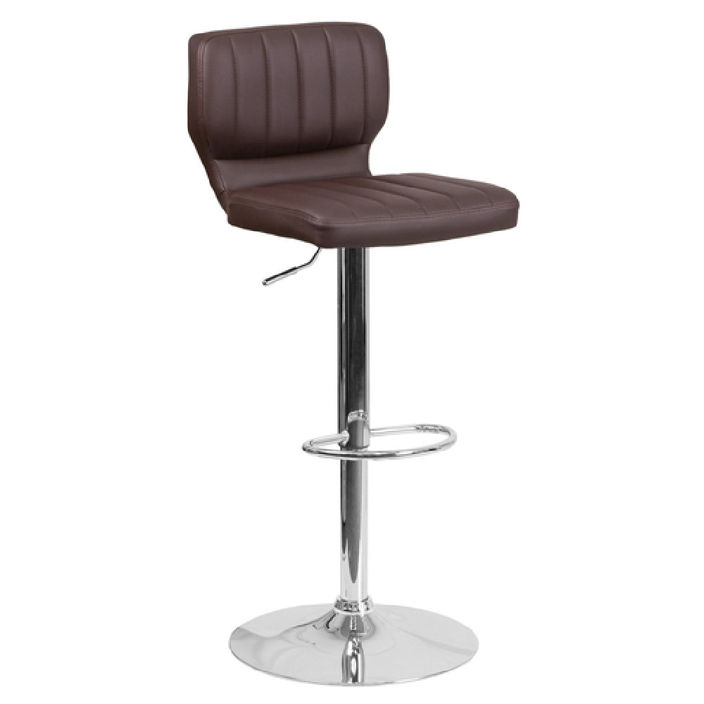 The Flash Furniture CH-132330-BRN-GG Swivel Barstool is a versatile commercial-grade indoor seating solution designed for hospitality environments such as restaurants, bars, and lounge areas. This adjustable-height bar stool features a contemporary style with a low back and upholstered vertical-lined seat and back, providing both comfort and modern aesthetics. Equipped with a gas lift mechanism, it transitions smoothly from counter to bar height, making it ideal for versatile seating arrangements in medium-volume foodservice operations. Its durable chrome base with a 17-5/8" diameter ensures stability, while the vinyl upholstery caters to ease of cleaning and enhanced longevity in high-traffic settings. This model supports ergonomic and functional seating in bustling commercial environments, crafted for resilience and user comfort.