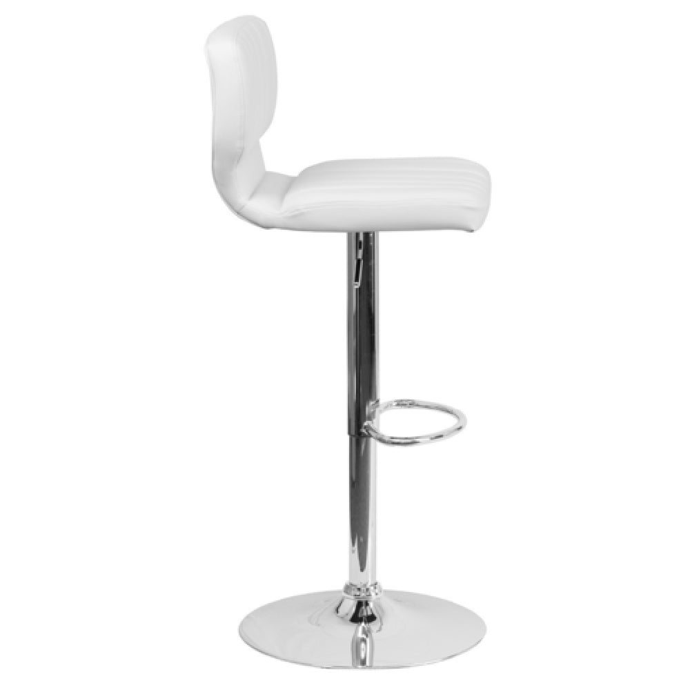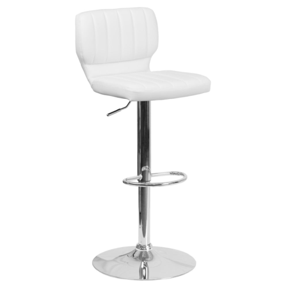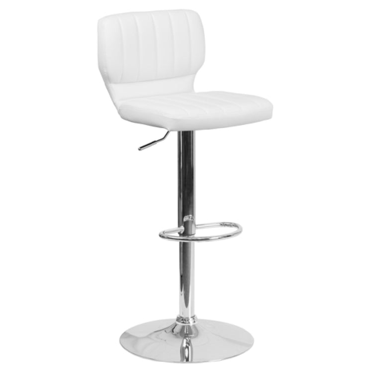 The Flash Furniture CH-132330-WH-GG Swivel Barstool is a commercial-grade indoor seating solution designed to enhance contemporary bar and counter environments. This adjustable height stool features a sleek, upholstered back and seat with vertical lines, complemented by a durable chrome 17-5/8" diameter base and gas lift mechanism for seamless height changes from counter to bar level. Constructed with fire-retardant foam and white vinyl upholstery, it adheres to safety standards suitable for residential and hospitality settings, offering precise dimensional control at 16-1/2"W x 19"D x 34-1/2" to 43"H. Its versatility and technical robustness make it a practical choice for high-traffic venues requiring reliable, ergonomic seating with easy maintenance and durable materials.