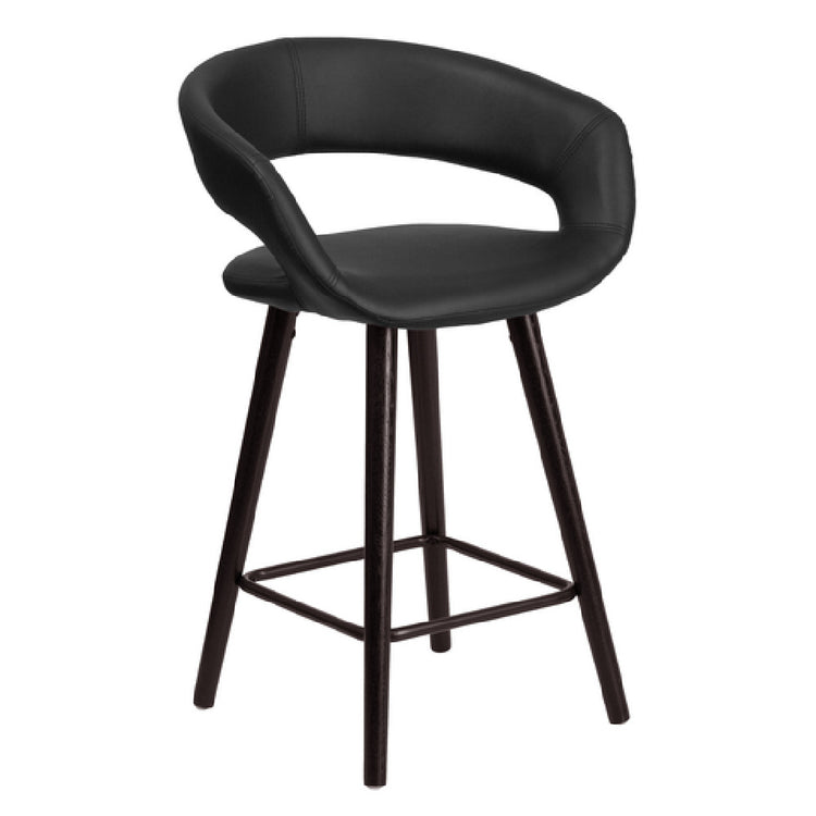The Flash Furniture Brynn Series Bar Stool, model number CH-152561-BK-VY-GG, is a contemporary indoor seating solution designed for commercial and residential settings. This 24-inch counter height stool features a sturdy wood frame with a smooth cappuccino finish, complemented by a low upholstered backrest and cushioned seat. Constructed for durability, it incorporates fire-retardant foam compliant with CA117 standards, making it suitable for hospitality, catering, and entertainment venues. Its precise dimensions optimize space utilization and ergonomic comfort, positioning it as an ideal solution for bar areas and casual dining spaces where reliable, stylish seating is required.