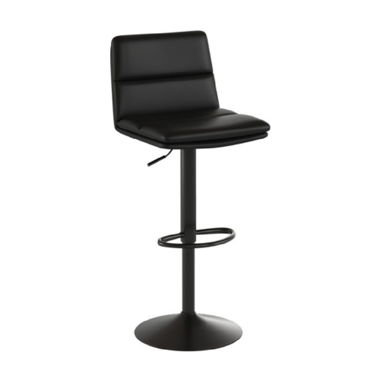 The Hughes Bar Stool features a robust steel pedestal base with a height of 43.25 inches, width of 19.75 inches, and depth of 21.75 inches, supporting an overall weight of 45.45 pounds. The upholstered seat and back are covered in channel-stitched LeatherSoft, optimized for comfort and easy maintenance. This model does not require electrical power and is constructed from durable materials suitable for frequent cleaning. Its black finish enhances its versatility in various design schemes, while the built-in rubber ring protects flooring from scuffs. The adjustable height range and swivel function facilitate ergonomic use in busy commercial environments. The stool is assembled with minimal effort using common tools and includes all necessary components.