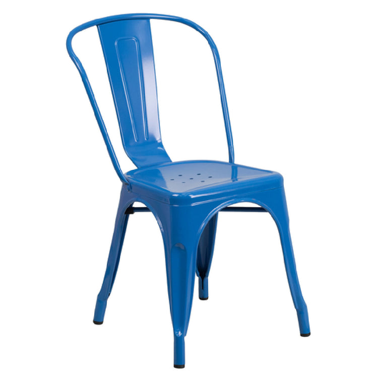 The Flash Furniture CH-31230-BL-GG chair is built with a galvanized steel frame coated in a durable powder finish, available in a vibrant blue color. It features a seat height of 33 inches, width of 18 inches, and depth of 20 inches, with a total weight of 10.2 lbs. The metal seat and back are combined with a cross brace under the seat to ensure stability under load. The chair meets industry standards for commercial indoor and outdoor use, with corrosion-resistant materials suitable for frequent cleaning. Its compact footprint and stackable design facilitate efficient storage in busy hospitality or cafeteria settings, providing ergonomic support with drain holes for water runoff and minimal upkeep.