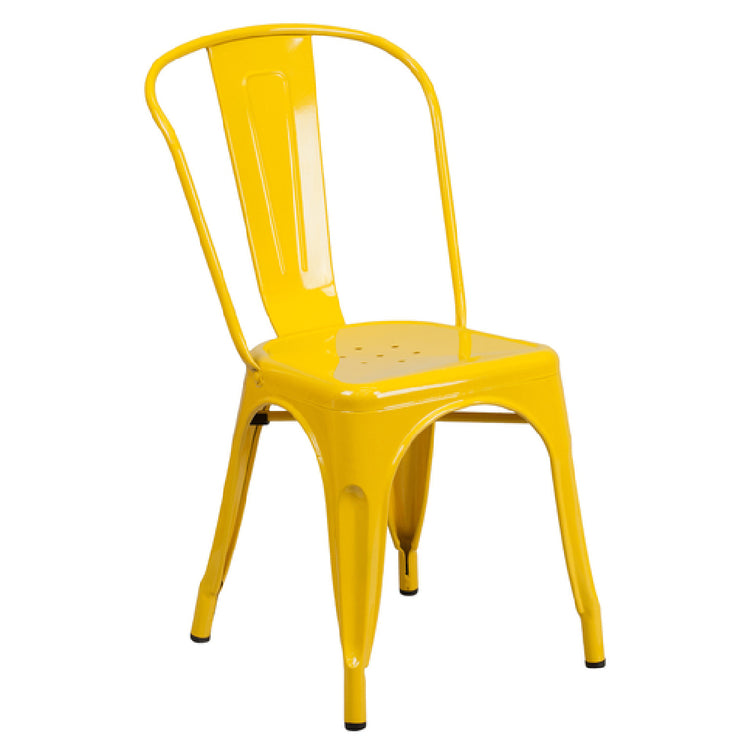 The Flash Furniture CH-31230-YL-GG features a galvanized steel frame with a powder coat finish ensuring corrosion resistance for outdoor durability. Its dimensions of 18 inches in width, 20 inches in depth, and 33 inches in height make it a compact, restaurant-ready option. The metal seat and back provide ergonomic support, complemented by drain holes in the seat to facilitate water runoff, making it suitable for outdoor applications. With a weight of 10.2 lbs per chair, it is designed for ease of handling and stacking, supporting up to eight chairs high for efficient storage. Its construction allows operation in various weather conditions, and the anti-slip plastic floor glides prevent surface damage and enhance safety during repositioning. Though primarily designed for indoor/outdoor use, its robust build quality ensures long-term operational performance under moderate to high workloads.