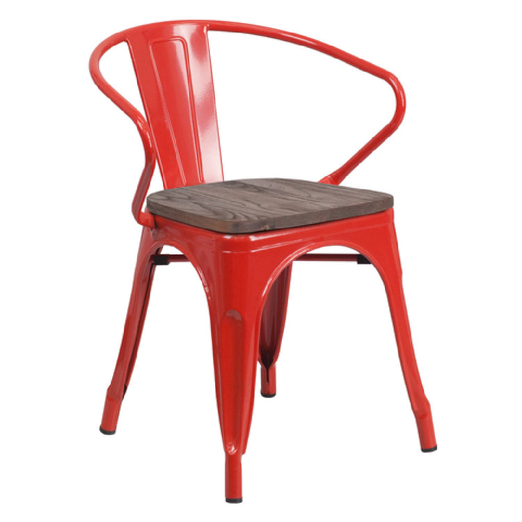 The Flash Furniture CH-31270-RED-WD-GG Stacking Armchair is a commercial-grade indoor seating solution suited for hospitality and foodservice environments. Crafted from galvanized steel with a textured wood seat, this chair offers a robust 500 lb. weight capacity and a bistro style aesthetic. The model features a metal curved back with vertical slats, integrated arms, and a cross brace with protective plastic caps, ensuring stability and durability. Its stackable design allows stacking up to 8 chairs high, optimizing storage and workflow efficiency in bustling dining areas or cafeterias. With a powder coat finish and plastic floor glides, this armchair combines industrial resilience with aesthetic appeal, making it ideal for high-traffic commercial seating applications.