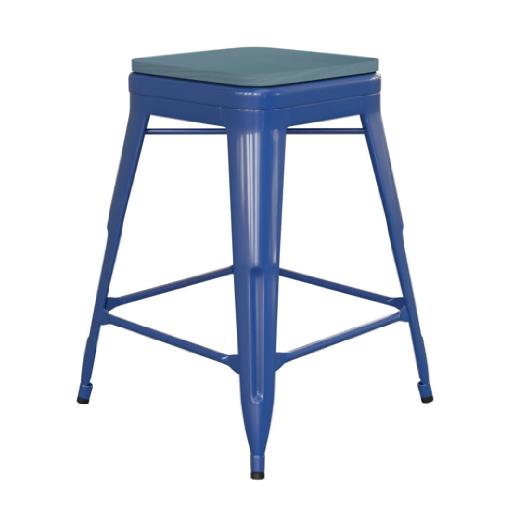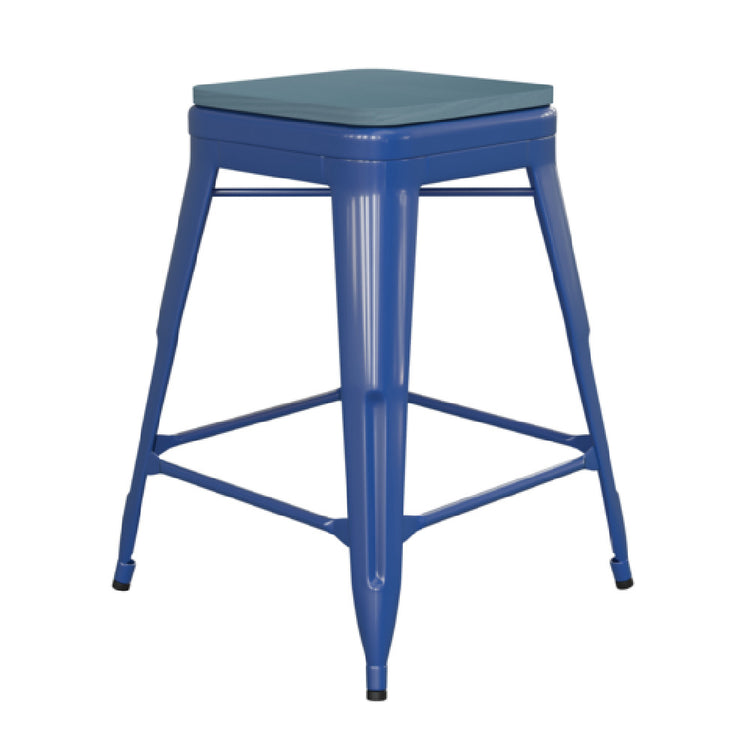 The Flash Furniture CH-31320-24-BL-PL2C-GG Kai Bar Stool is a commercial-grade indoor stacking stool designed for high-capacity seating in hospitality environments. Constructed with galvanized steel and a durable powder coat finish, this counter height stool features a backless teal blue poly resin wood seat supported by a cross brace under the seat for enhanced stability. With a robust 500 lb. weight capacity, it addresses the requirements for heavy-use applications in bars, cafes, and catering venues, making it an ideal solution for efficient, reliable seating in commercial foodservice settings.