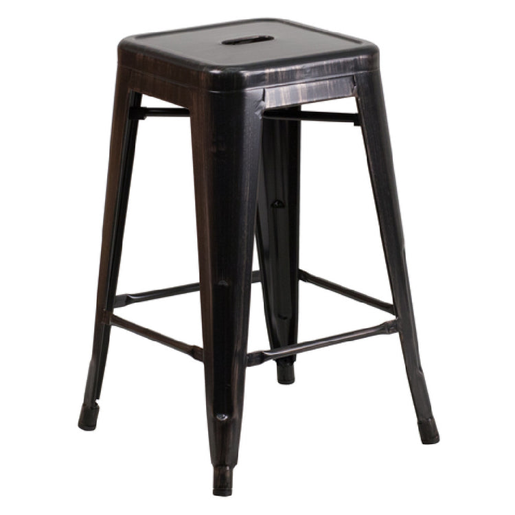 Flash Furniture, CH-31320-24-BQ-GG, Bar Stool, 500 lb. weight capacity, counter height, backless, drain hole in seat, cross brace under seat, galvanized steel, powder coat finish, footrest, plastic floor glides, lightweight, designed for indoor/outdoor commercial and residential use, stacks 4 to 8 stools high, black-antique gold (assembly required) (in stock items usually ship within 24 hours)