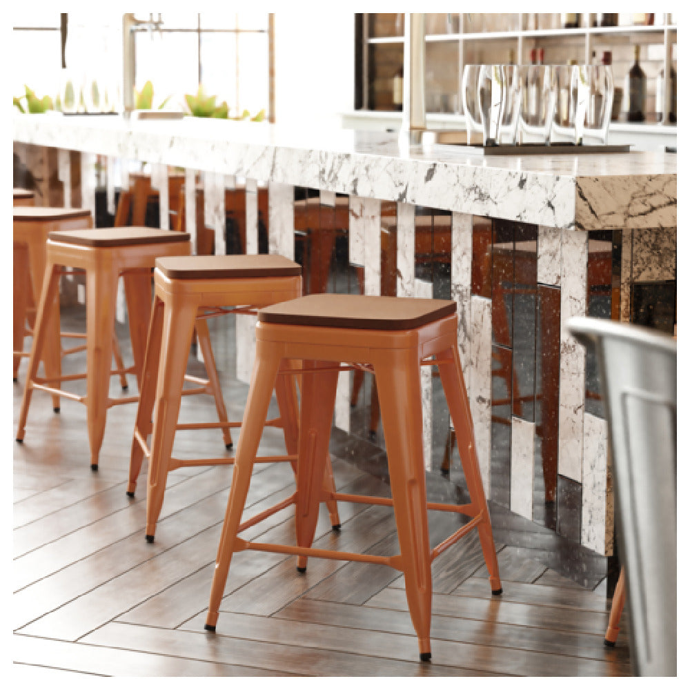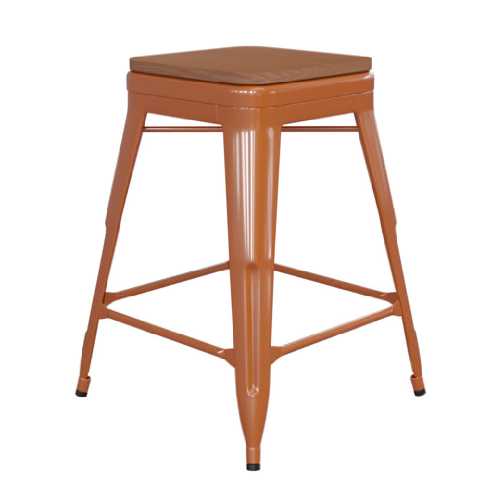 The Flash Furniture CH-31320-24-OR-PL2T-GG Kai Bar Stool is a commercial-grade indoor stacking seating solution designed for high-capacity hospitality environments. Crafted by Flash Furniture, this counter-height backless stool features a sturdy teak poly resin wood seat capable of supporting up to 500 pounds. Its galvanized steel construction and powder coat finish ensure exceptional durability and corrosion resistance, making it suited for busy foodservice settings such as bars, cafés, or lounges that require reliable, long-lasting seating. The 24.75-inch height, combined with lightweight stacking features, facilitates efficient storage and swift rearrangement, optimizing workflow in moderate volume service applications.