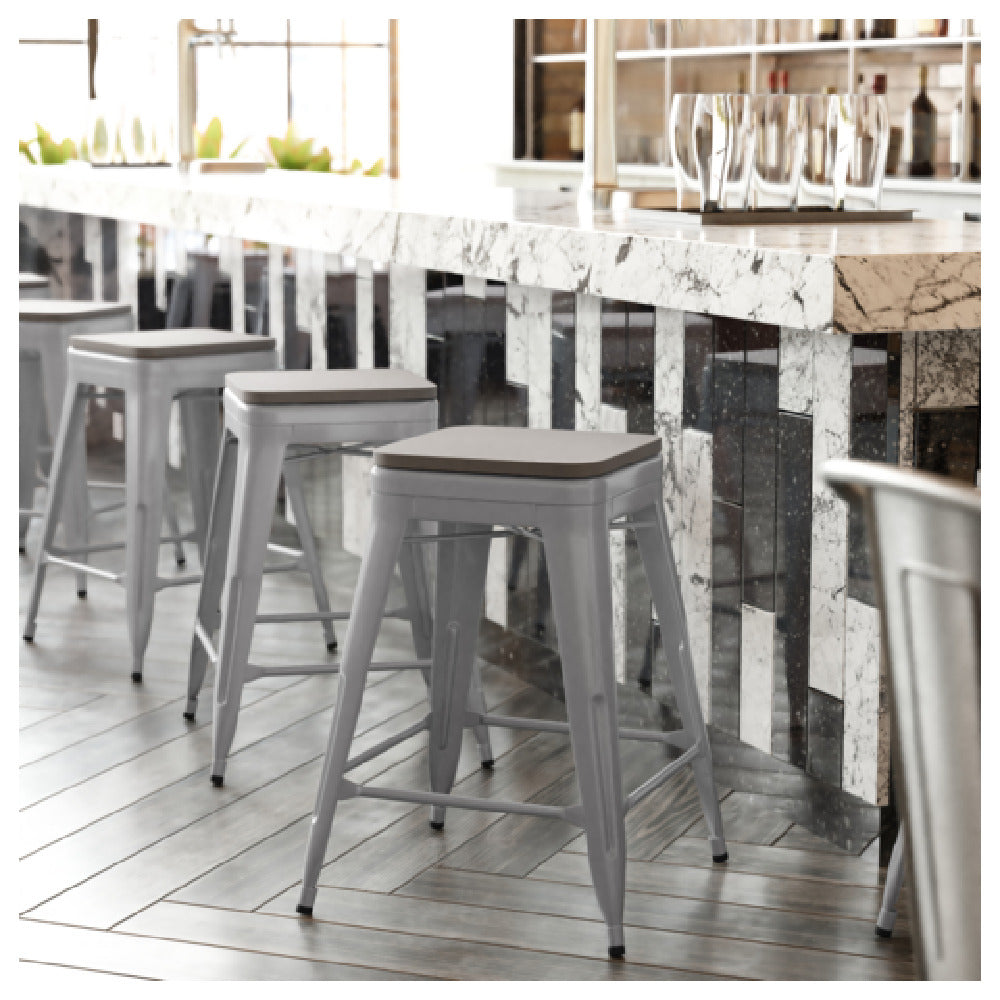 The Kai Bar Stool from Flash Furniture, model CH-31320-24-SIL-PL2G-GG, is a high-capacity, fine-tuned seating solution built for moderate throughput settings including cafes, bars, and casual dining. Supporting nonstop use, its galvanized steel structure and lightweight design promote efficient workflow and space management. Designed specifically for indoor applications, it provides reliable longevity and ergonomic comfort in busy hospitality outlets.