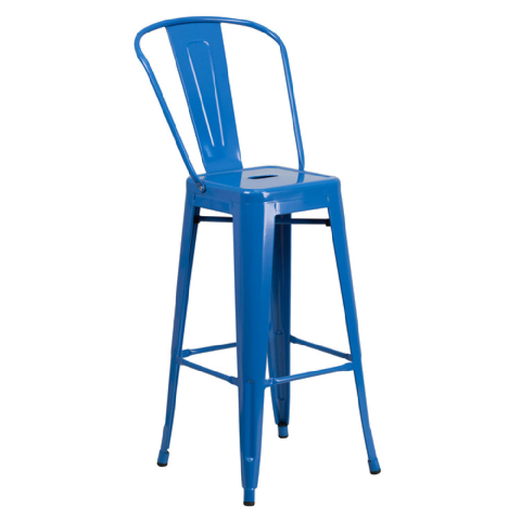 Flash Furniture, CH-31320-30GB-BL-GG, Bar Stool, 500 lb. weight capacity, curved back with vertical slat, drain hole in seat, cross brace under seat, galvanized steel, powder coat finish, footrest, plastic floor glides, lightweight, designed for indoor/outdoor commercial and residential use, blue (assembly required) (in stock items usually ship within 24 hours)