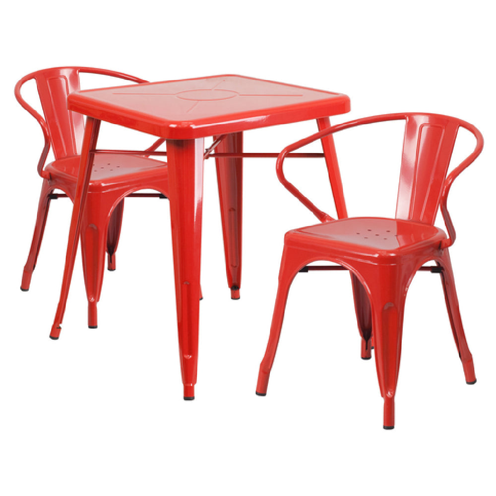 The Flash Furniture CH-31330-2-70-RED-GG Chair and Table Set is a commercial outdoor furniture solution designed for durability and functional reliability in various foodservice environments. This set includes a square table measuring 23-3/4" W x 23-3/4" D x 29" H, with a 27-3/4" by 27-3/4" footprint, and two arm chairs measuring 21-1/2" W x 19" D x 27-3/4" H. Made from galvanized steel with a powder coat finish, the set offers weather resistance for indoor and outdoor commercial or residential applications. The 2-inch thick edged table features a cross brace for added stability, while the chairs feature vertical slat curved backs, integrated armrests, drainage holes, and a cross brace beneath the seat for enhanced longevity. The set's design facilitates easy assembly, maintenance, and placement in areas requiring robust, corrosion-resistant furniture for high-traffic environments or versatile use cases.