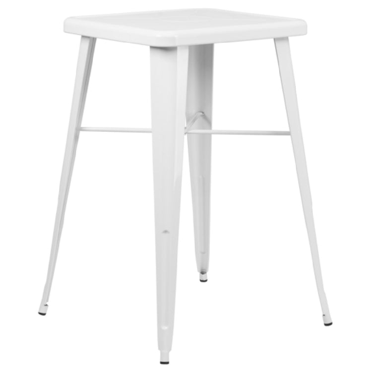 A commercial bar height table is a durable, professionally designed surface typically installed in hospitality, foodservice, and retail spaces to facilitate seating, serving, and workspace needs. Made from rugged materials like galvanized steel, these tables support moderate activity volumes and are built for indoor and outdoor environments. The Flash Furniture CH-31330-WH-GG Table is a square, indoor, bar height model with a 23-3/4" surface and 40" height, perfect for high-traffic settings such as cafes or bars, and supports efficient space use and ease of maintenance in busy foodservice operations.