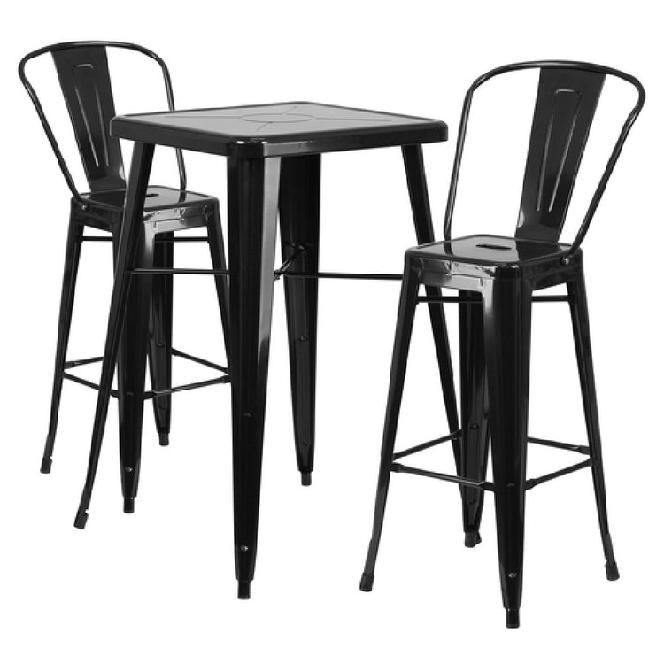 Designed for outdoor and indoor commercial foodservice environments, this high-top table and bar stool set offers weather-resistant galvanized steel construction with a powder coat finish. Its square table with a thick edge supports casual dining and socialization, while the curved-back bar stools provide ergonomic comfort. Easy to clean, the set's materials require minimal maintenance, making it suitable for busy hospitality spaces with moderate throughput. Its sturdy cross braces and footrest address stability and user comfort, optimizing workflow and guest experience in outdoor cafes, bars, or casual eateries.