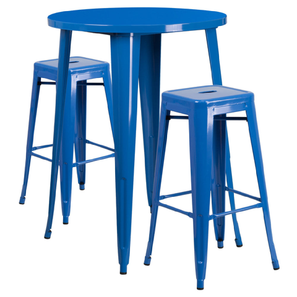 This set features a 41-inch height, a 30-inch diameter round table with a weight of 64.7 lbs, constructed from weatherproof powder-coated metal for extended outdoor use. The table and stools are prepared for easy assembly, with the support brace and drain holes incorporated into the design to facilitate maintenance and durability. It is designed to withstand outdoor environmental conditions with a temperature operating range suitable for typical outdoor temperatures. The set’s color is a classic blue finish, providing a neutral yet vibrant aesthetic suitable for outdoor hospitality applications. The overall dimensions ensure compatibility with standard commercial space constraints, supporting moderate seating capacity and workflow efficiency in outdoor dining or beverage service settings.