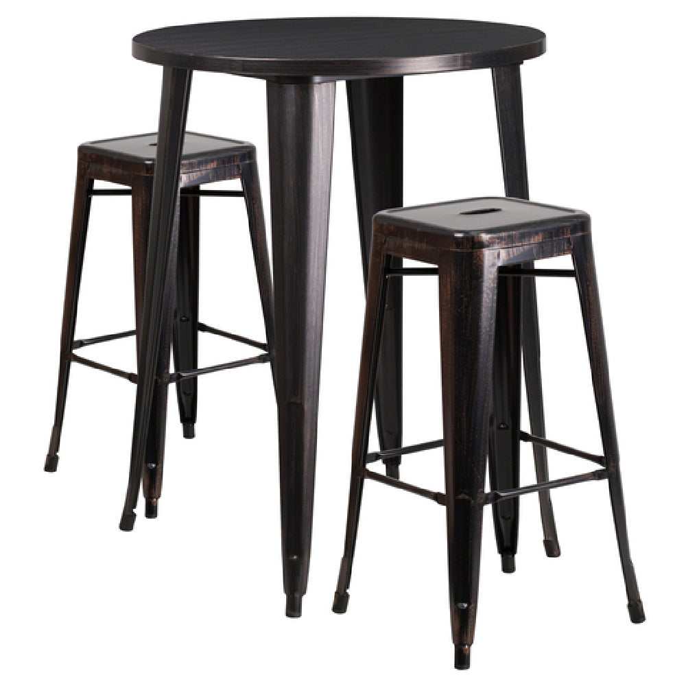 Flash Furniture, CH-51090BH-2-30SQST-BQ-GG, Table and Bar Stool Set, includes (1) 30" dia. x 41"H table, bar height, round, smooth top, 1-1/4" thick edge, brace underneath top, (2) bar stools, backless, square seat with drain holes, cross brace under seat, footrest, metal, powder coat finish, rubber floor glides, designed for indoor/outdoor commercial and residential use, black and antique gold (assembly required) (shipped in 2 boxes) (in stock items usually ship within 24 hours)