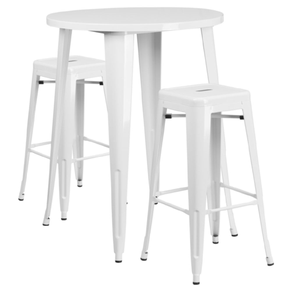 The Flash Furniture CH-51090BH-2-30SQST-WH-GG set features an all-metal construction finished with a weather-resistant powder coating. The tabletop measures 30 inches in diameter with a 41-inch height suitable for bar-height seating. Each stool consists of a square seat with integrated drain holes and cross braces for stability, supporting moderate indoor or outdoor workloads. The set weighs approximately 64.7 pounds, with shipping details indicating typical dispatch within 1 to 2 days. Electrical requirements are not applicable, as this is a furniture set designed for physical placement. The finish resists corrosion and is easy to clean, supporting outdoor durability and sanitation. Assembly involves straightforward setup, with adjustable rubber floor glides to ensure stability on uneven surfaces. The set’s dimensions and weight optimize space efficiency for commercial environments such as outdoor seating areas or patio zones.
