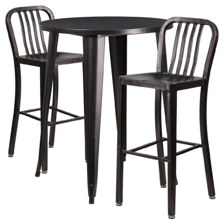 The Flash Furniture CH-51090BH-2-30VRT-BQ-GG set features a metallic, powder-coated finish, with the table measuring 30 inches in diameter and 41 inches high, and each stool measuring 15-1/2 inches wide by 20 inches deep and 43 inches tall. The overall weight of the set is 80 lbs, with shipping weights varying based on packaging. The table's construction is engineered for outdoor resilience, with rubber floor glides to prevent surface damage. The stools feature adjustable glides for stability on uneven terrain, enhancing operational flexibility in diverse environments. Each piece is designed to withstand frequent commercial use while maintaining a modern aesthetic. No electrical, refrigeration, or cooling components are involved; the set is purely mechanical and structural in nature.