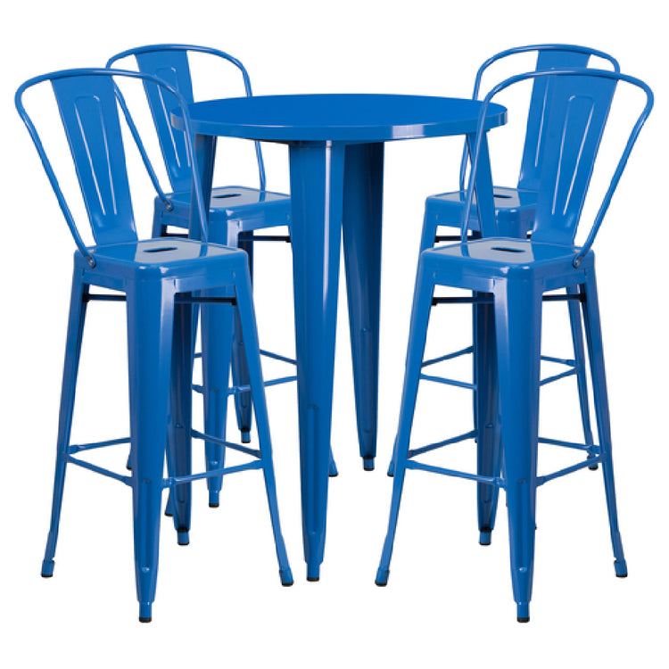 A commercial chair and table set is a durable, weather-resistant furniture ensemble designed for high-traffic hospitality environments. The Flash Furniture CH-51090BH-4-30CAFE-BL-GG features a sturdy metal construction with a powder-coated finish, making it suitable for outdoor use. It includes a 30-inch round table with a 41-inch height and four matching bar stools, equipped with drain holes and anti-slip glides. Ideal for cafes, bars, and outdoor dining areas, this set meets the demands of moderate-volume seating operations with a focus on functionality, longevity, and ease of maintenance.