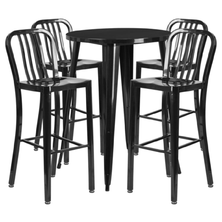 The Flash Furniture CH-51090BH-4-30VRT-BK-GG Table And Bar Stool Set is a commercial-grade outdoor furniture solution designed for versatile beverage and snack service in hospitality, hospitality, and entertainment environments. This set features a 30-inch diameter round table with a 41-inch height, a smooth top with a 1-1/4 inch thick edge, and a sturdy brace underneath for stability. Complemented by four matching bar stools measuring 15-1/2 inches wide by 20 inches deep and 43 inches high, equipped with vertical slat backs and footrests, all constructed with durable powder-coated metal. Rubber floor glides on the table and adjustable floor glides on the stools facilitate easy placement and protect flooring, making this set suitable for both indoor and outdoor high-traffic commercial and residential settings. The design emphasizes practicality and long-lasting performance, with materials optimized for frequent use and maintenance. This set provides an efficient footprint for space-constrained environments requiring reliable, stylish seating and surface solutions.